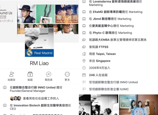 高瑞敏跟谁走了?起底了台湾男友在facebook的英文名字叫RM Liao背景资料起底是创新生技有限公司CEO,创新联合国际整合行销有限公司创办人,EltaMD创新专业防晒,Loveisderma爱斯德玛,PhytoC欧玛, Jbmd靓倍尔,爱美馆直购中心多个品牌经理,学历:政大EMBA,国籍: 新加坡