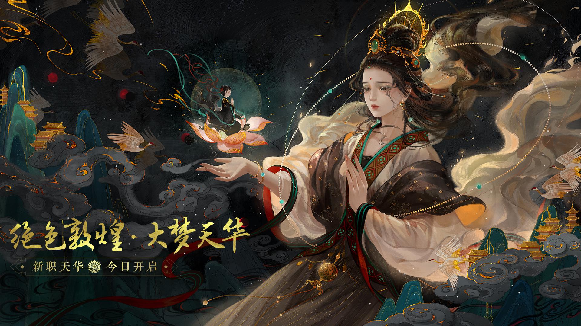 “大梦天华”是以敦煌文化为背景,延展开了全新的游戏剧情,新职业天华的设计也是从敦煌飞天中获得灵感,更将敦煌的标志性建筑莫高窟、标志性景观月牙泉等实景植入到游戏中,为游戏带来一抹浓重的西域色彩。