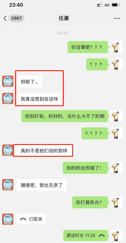 难道说任豪真的患上抑郁症了吗?还是说只是谢明皓和任豪的联合炒作?谢明皓还曝光了自己与任豪的聊天记录,事实上,任豪并没有说自己患上了抑郁症,只是说“抑郁了”,可能只是说自己的心情很郁闷,谢明皓却直接说任豪患上了抑郁症,确实是有些夸张了。